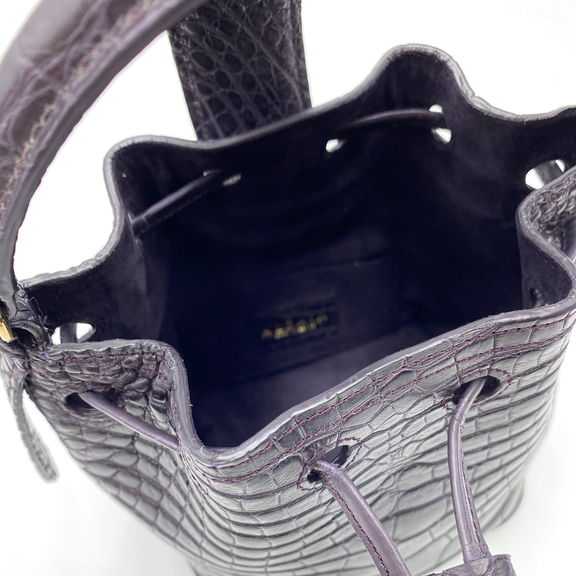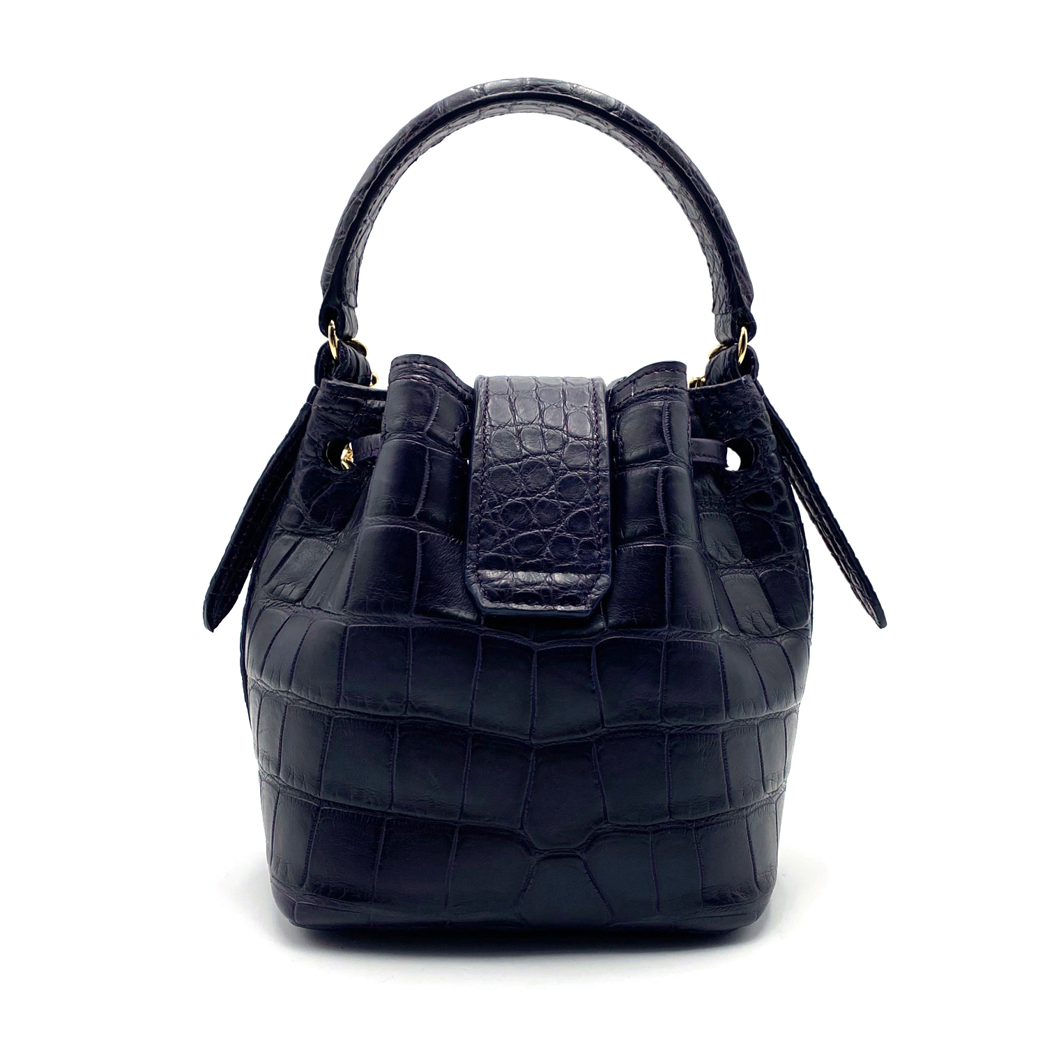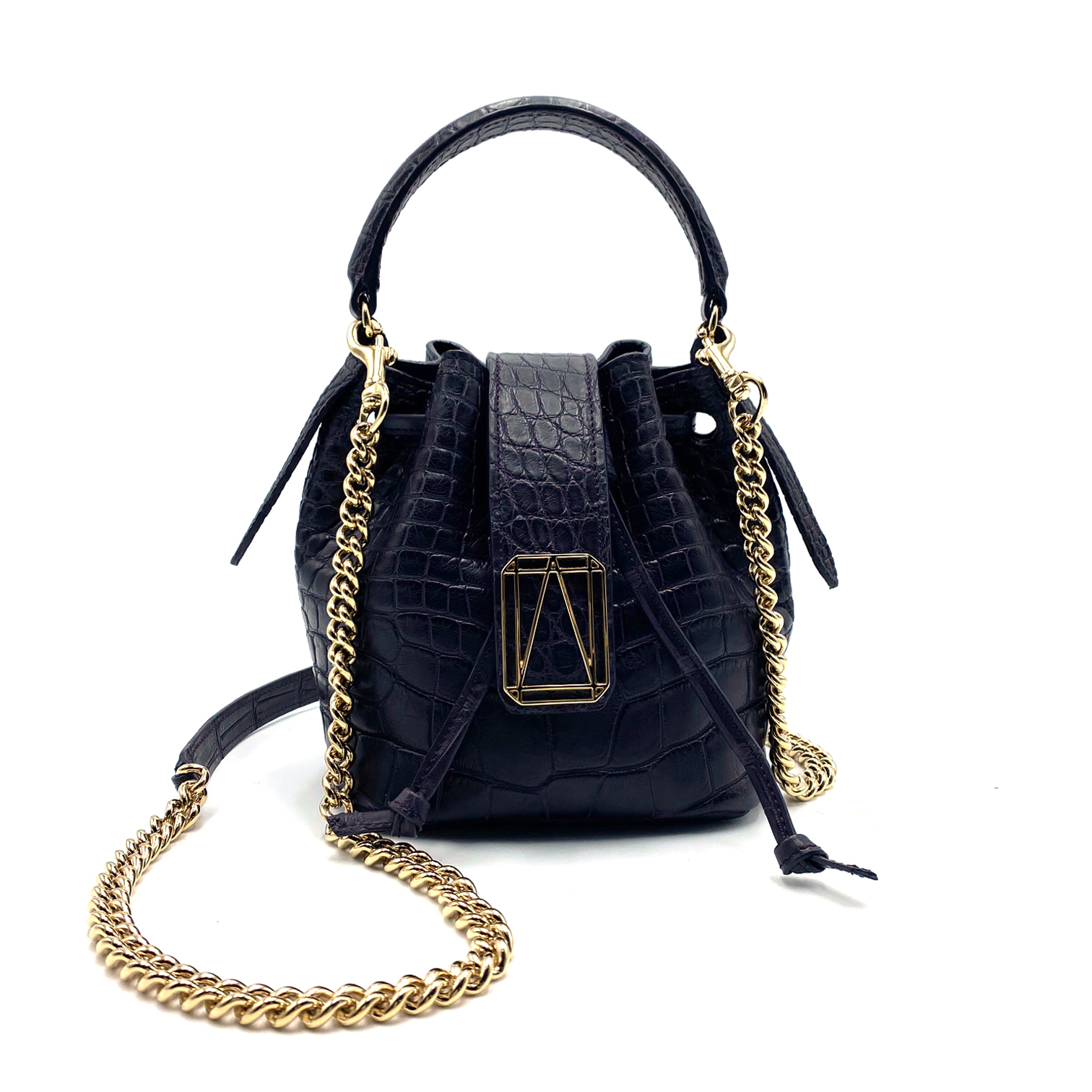 Handcrafted to perfection in exotic alligator silk leather and lining in tone on tone premium alcantara. Marilyn features our iconic logo in signature gold on the flap, drawstring closure and inside flat pocket. This evergreen bucket can be carried by hand or cross-body with chain strap.