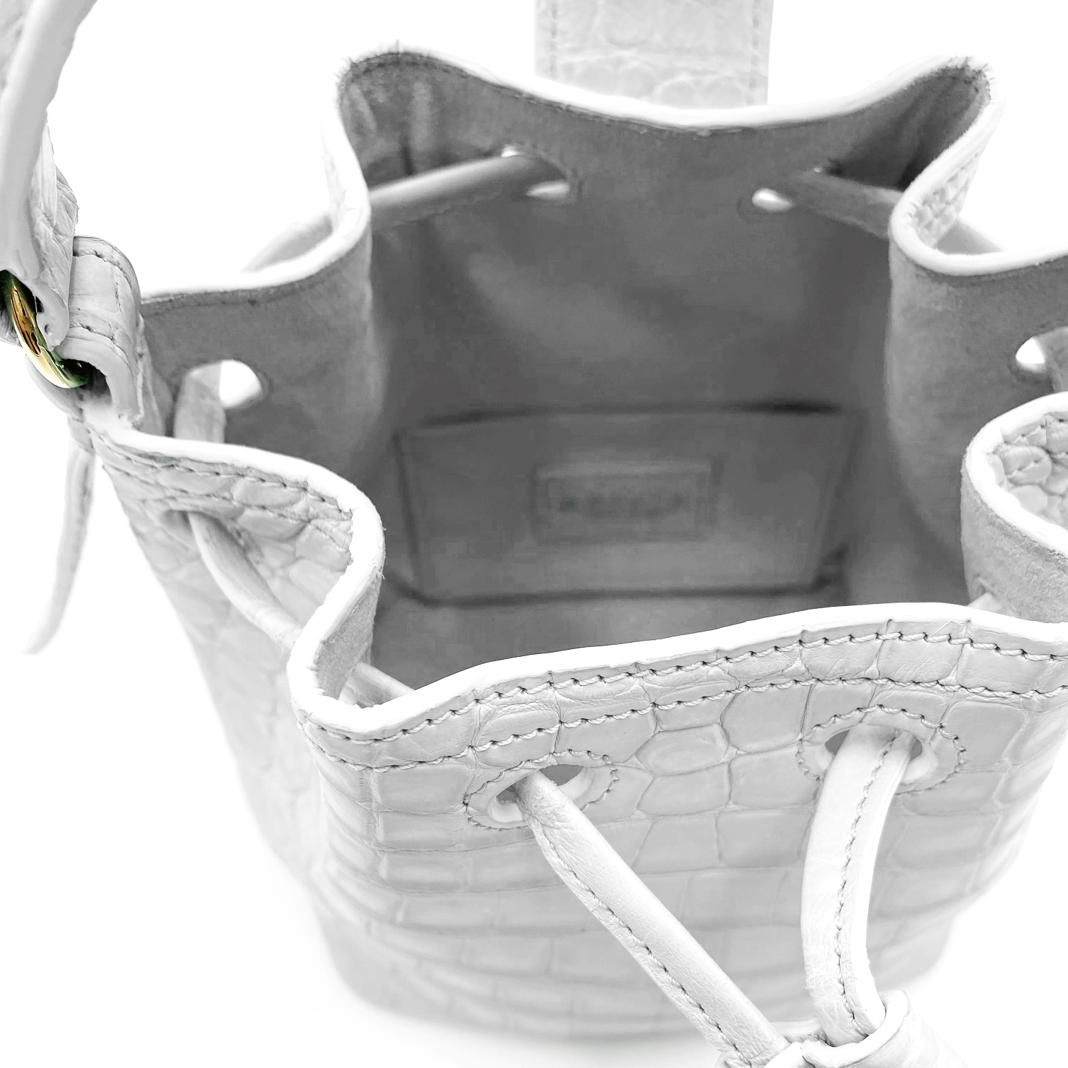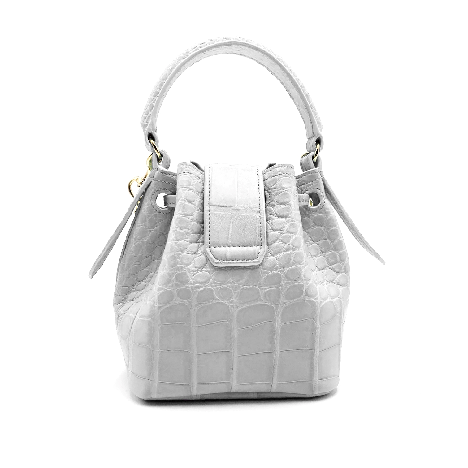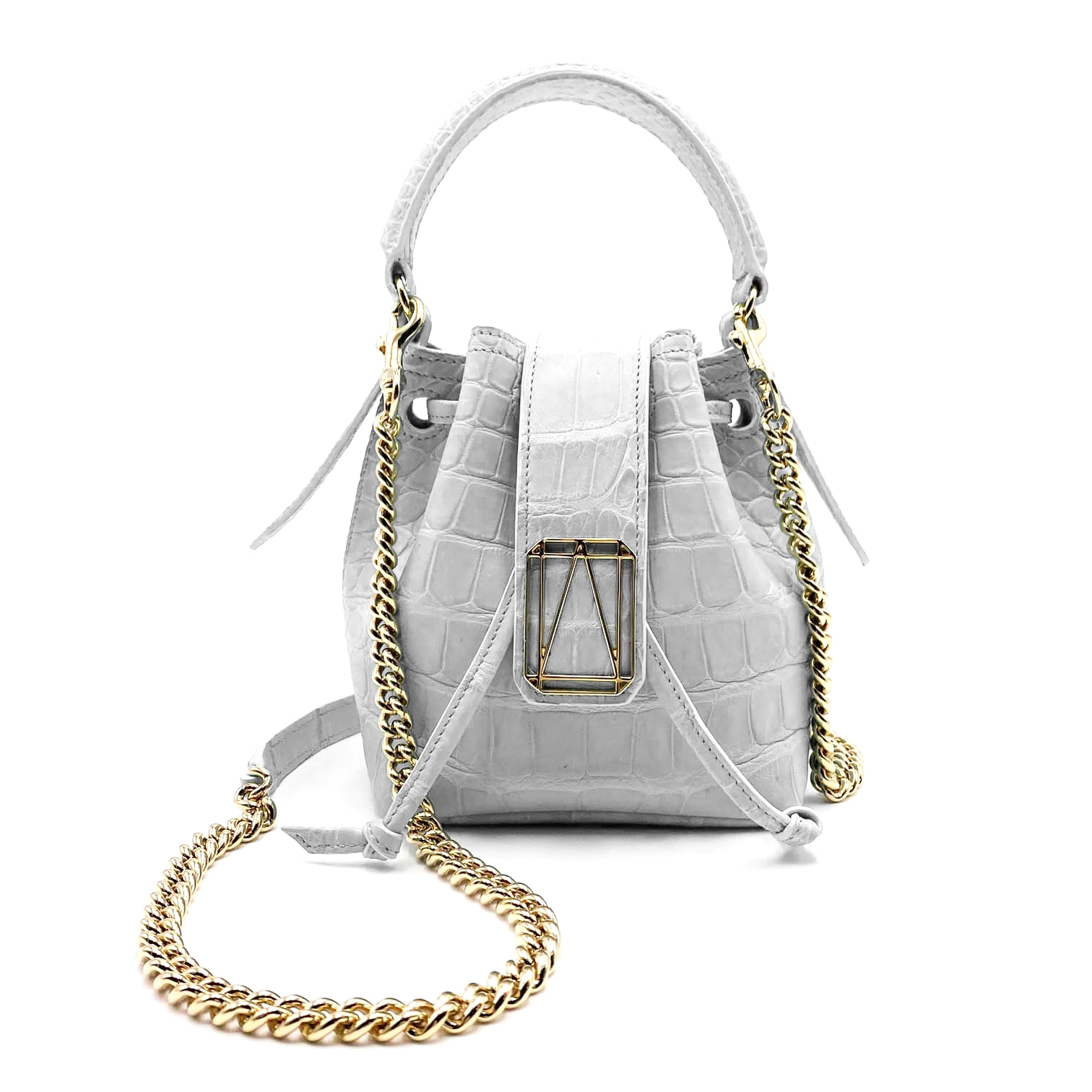 Handcrafted to perfection in exotic alligator silk leather and lining in tone on tone premium alcantara. Marilyn features our iconic logo in signature gold on the flap, drawstring closure and inside flat pocket. This evergreen bucket can be carried by hand or cross-body with chain strap.